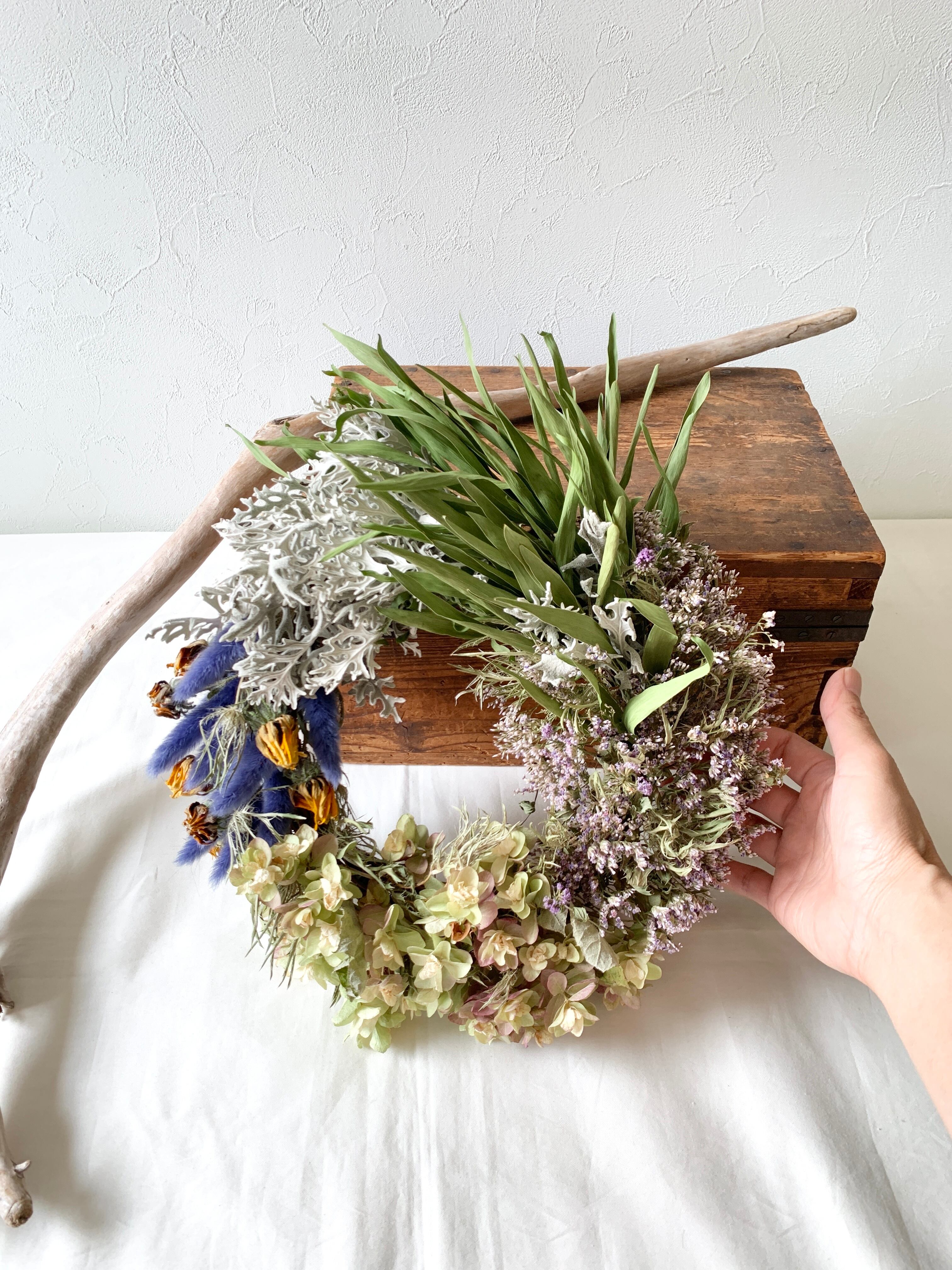 原っぱに吹く風を感じるようなイメージで、ナチュラルなドライフラワーを紡いで作ったリースです。流れのあるデザインを意識しながらも、エリアごとに少しづつ花材を変えて仕上げたエリアリースです。