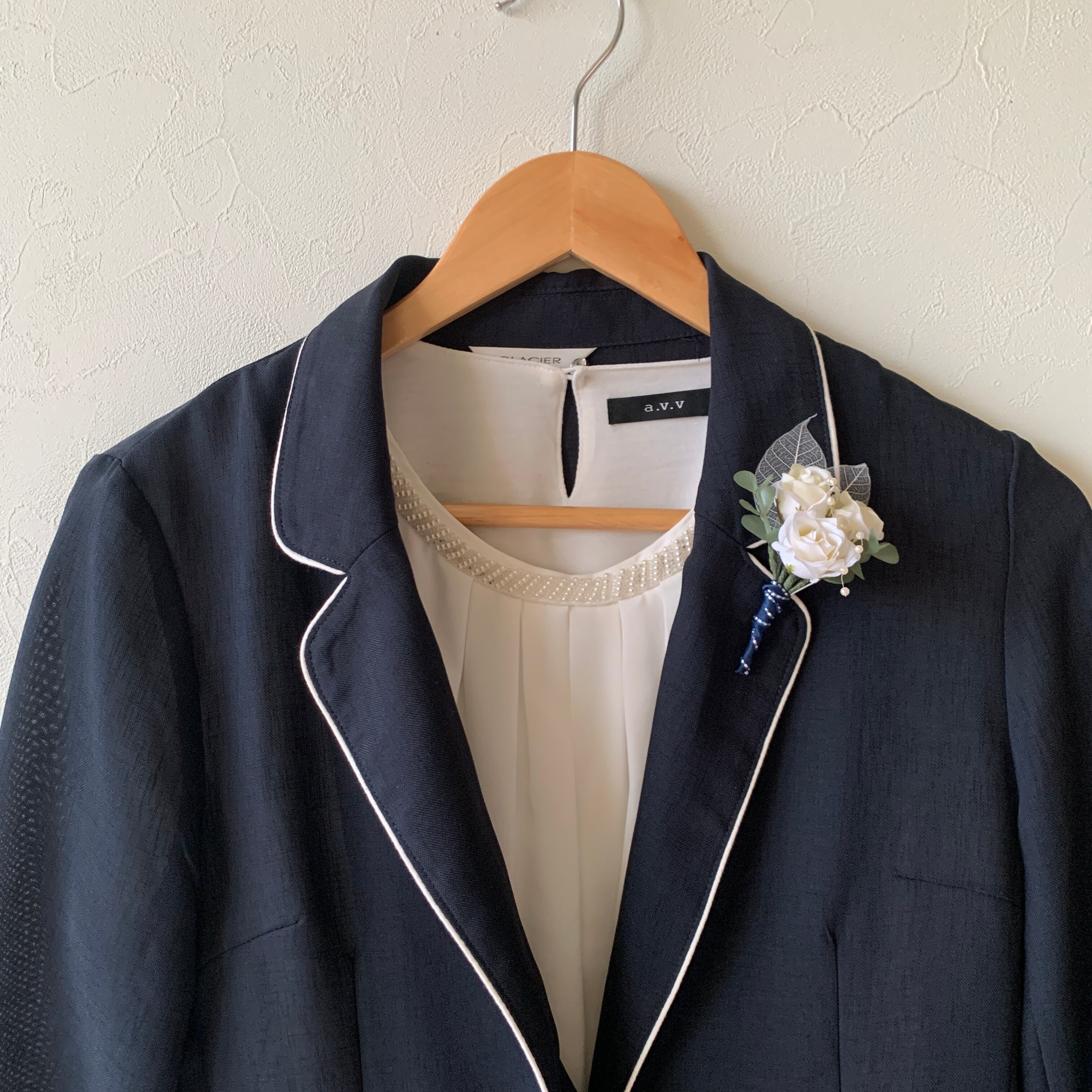 白薔薇とユーカリの組み合わせは、上品でナチュラル。また小さいながらもパールが入ることで、華やかさもあります。白フェザーは優しい雰囲気に女性らしさもプラス。装着時も造花なので壊れにくく、金色のブローチピンも扱いやすい3.4cmのサイズとなっています。ピンのひっかけ部分もカーブのあるタイプで装着が容易です。