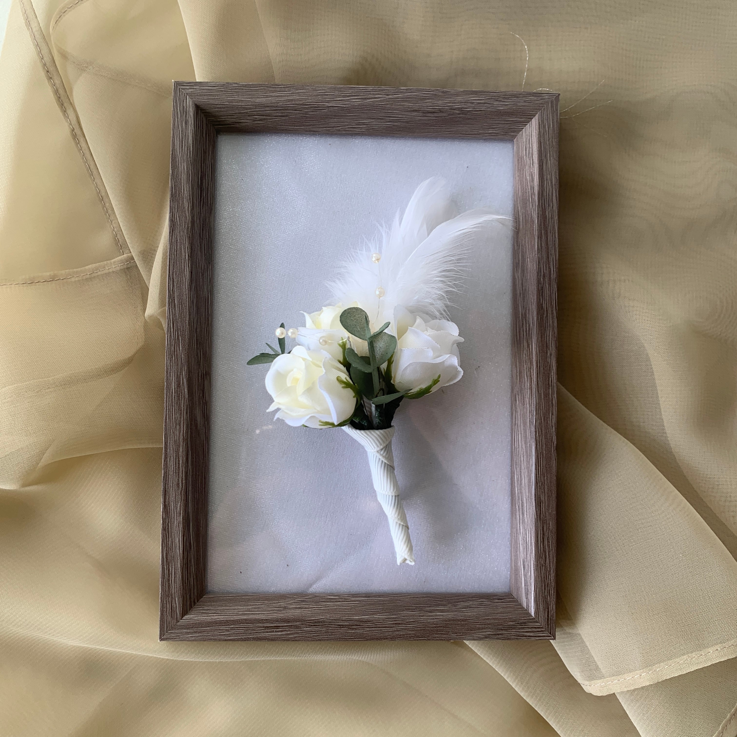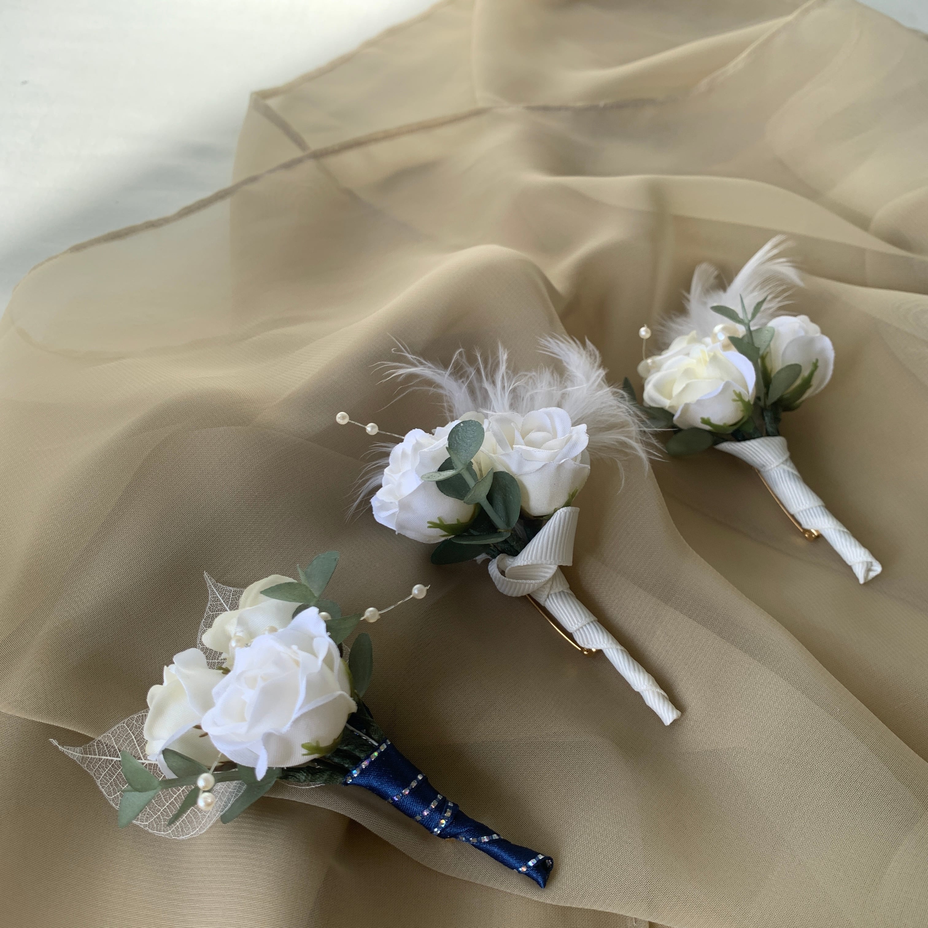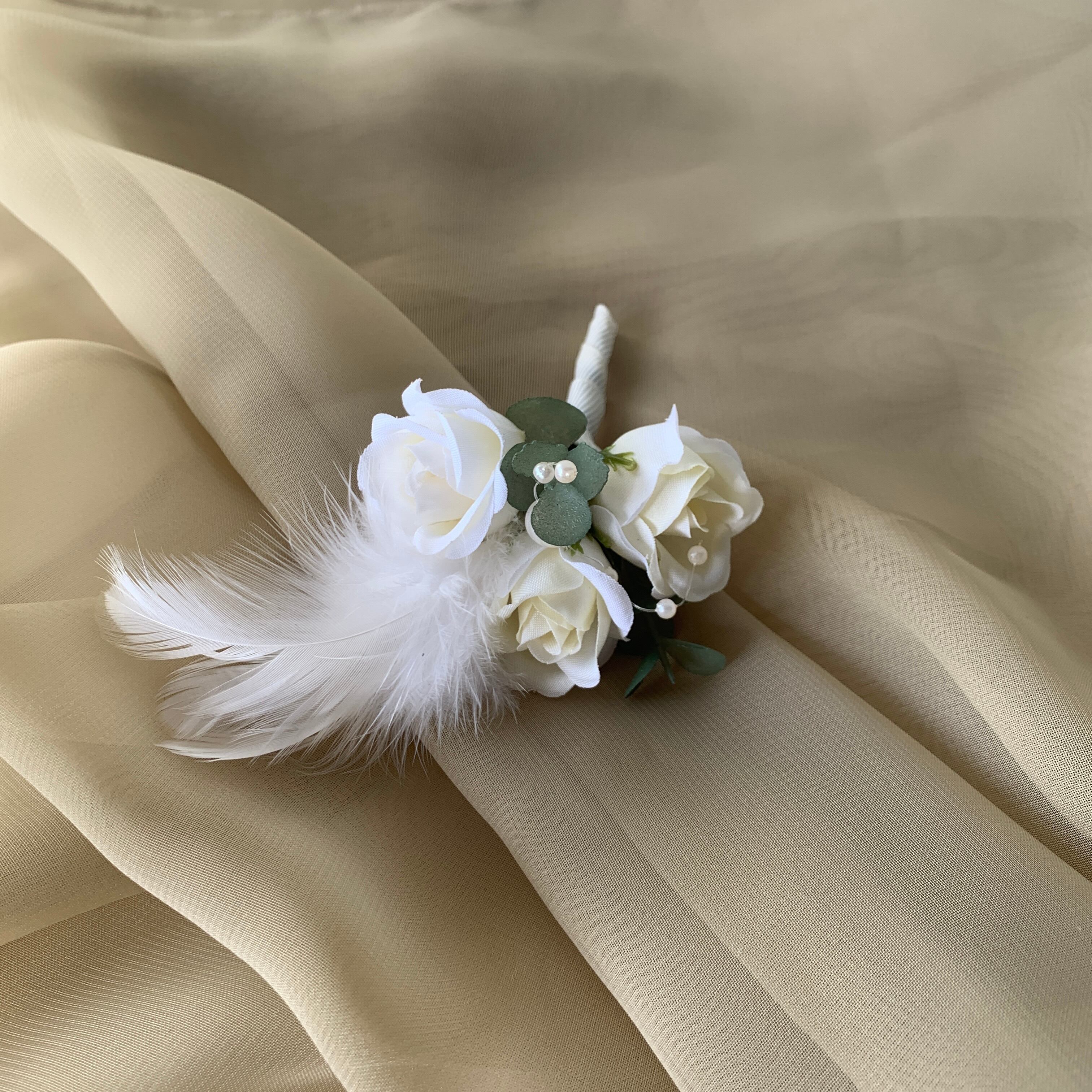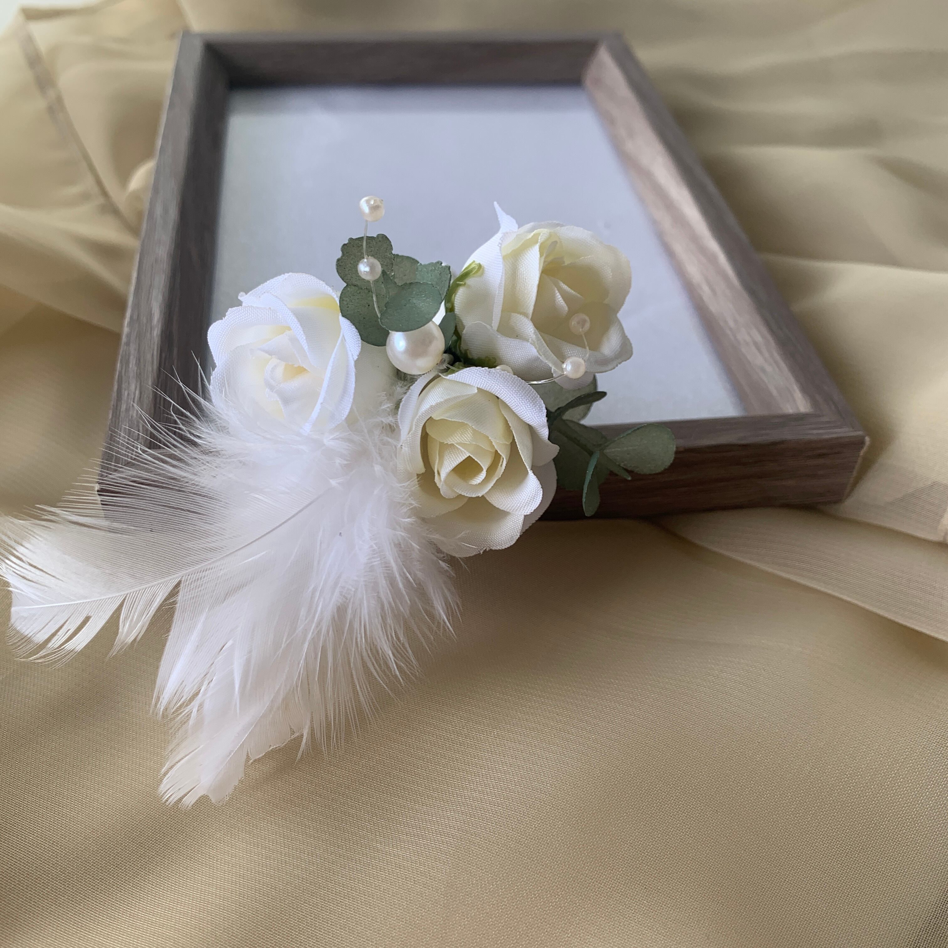 小ぶりのホワイトローズ3輪をキュッと、ひとまとめにして、動きのあるパールパーツや白フェザー、ユーカリの葉などを合わせました。