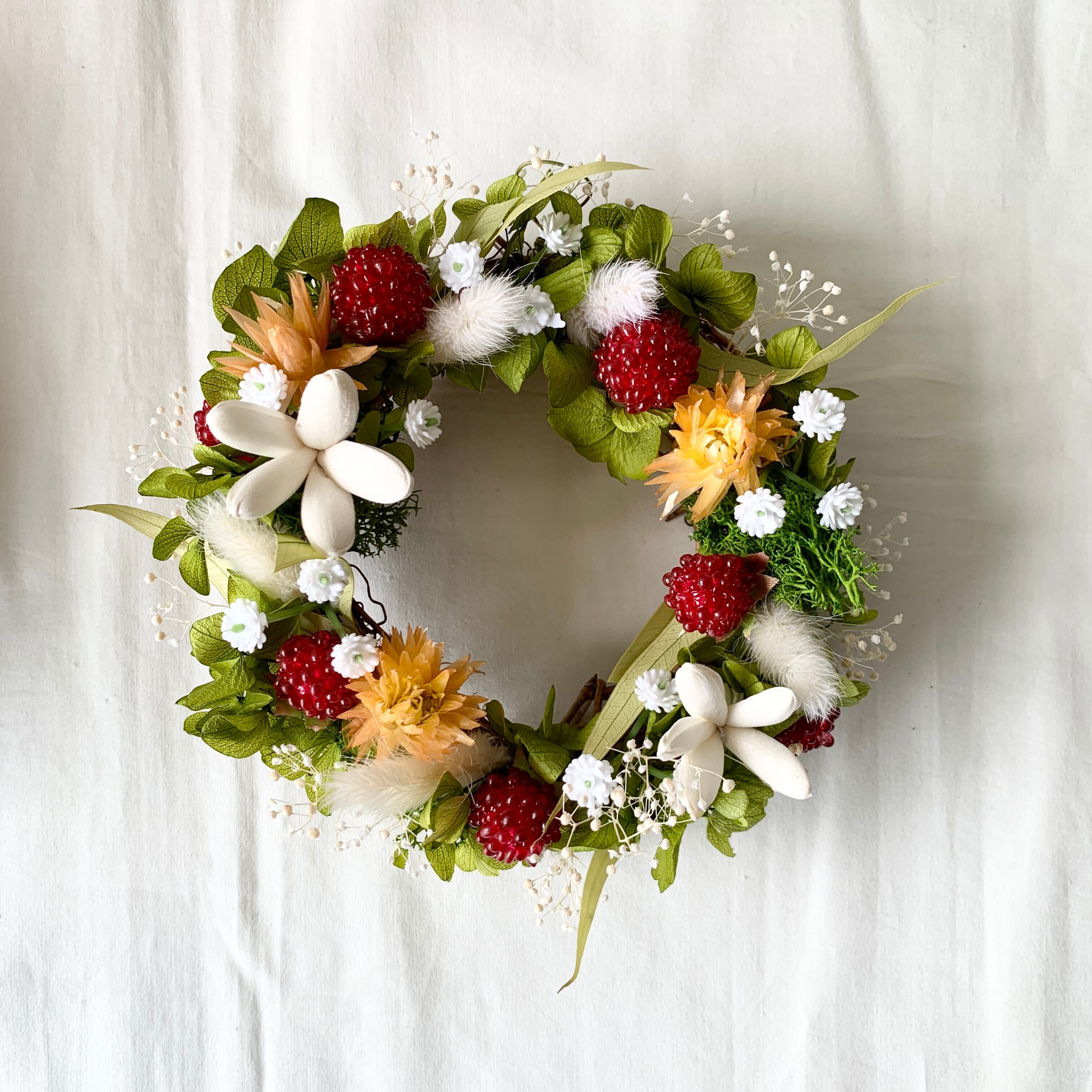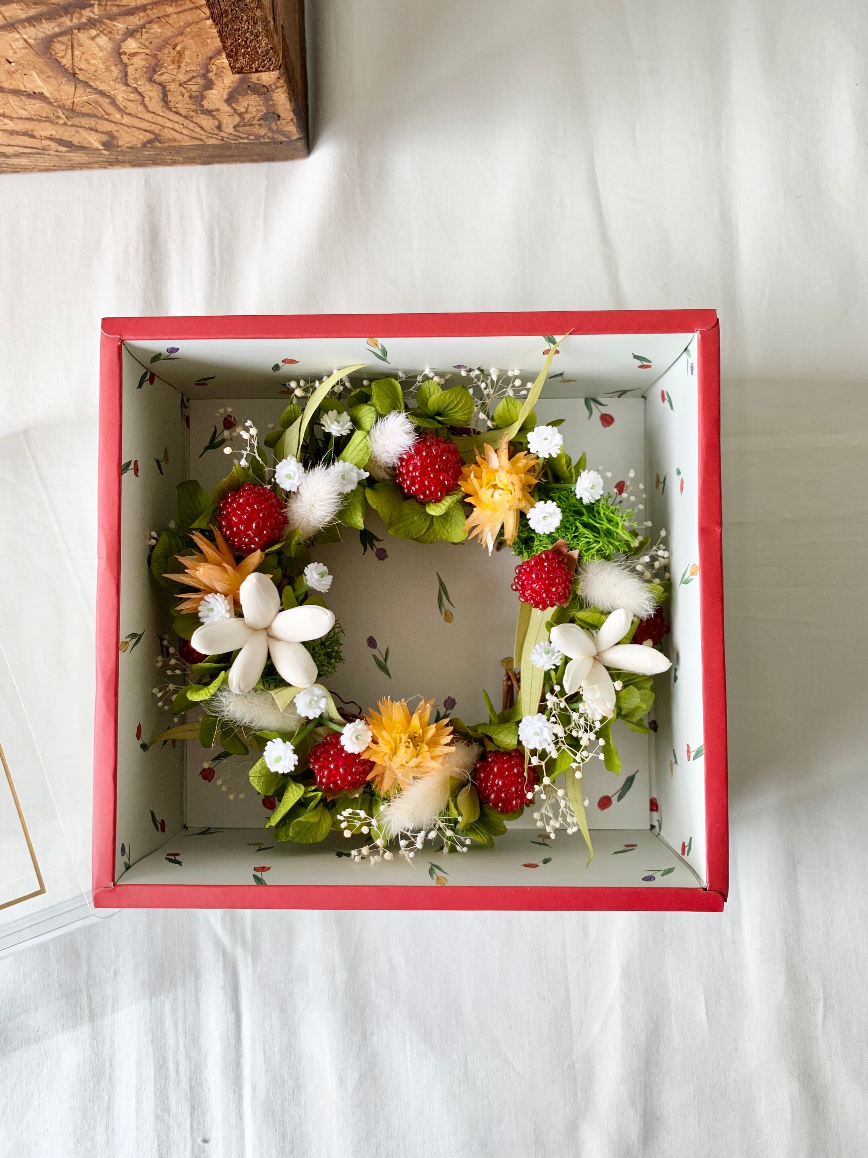 可愛いBOXに入ったミニリースです。つぶつぶの野いちごが、心躍る可愛さ。