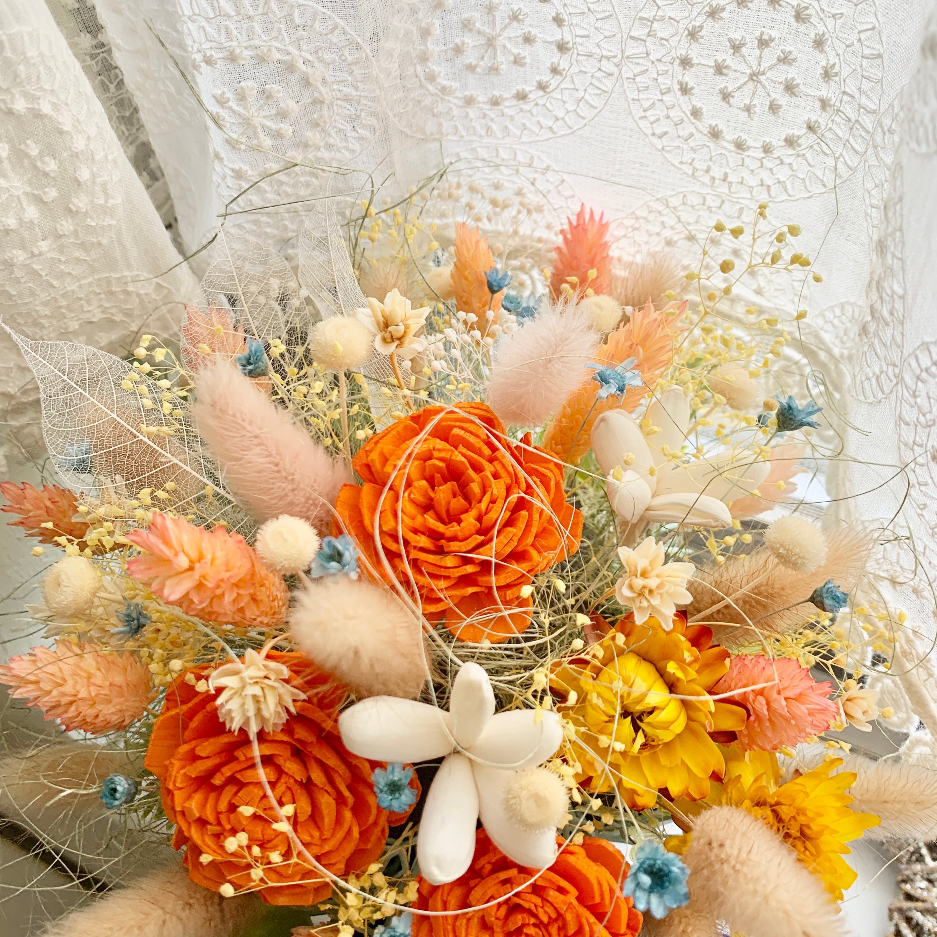 色鮮やかなビタミンカラーのオレンジのお花や、優しい雰囲気のドライフラワーたちで仕上げたお花は、リビングルームやオフィスのデスクに置くだけで、空間全体が明るくなり、気持ちも晴れやかになります。ギフトで受け取った方にも、元気と優しさを与えてくれるでしょう。