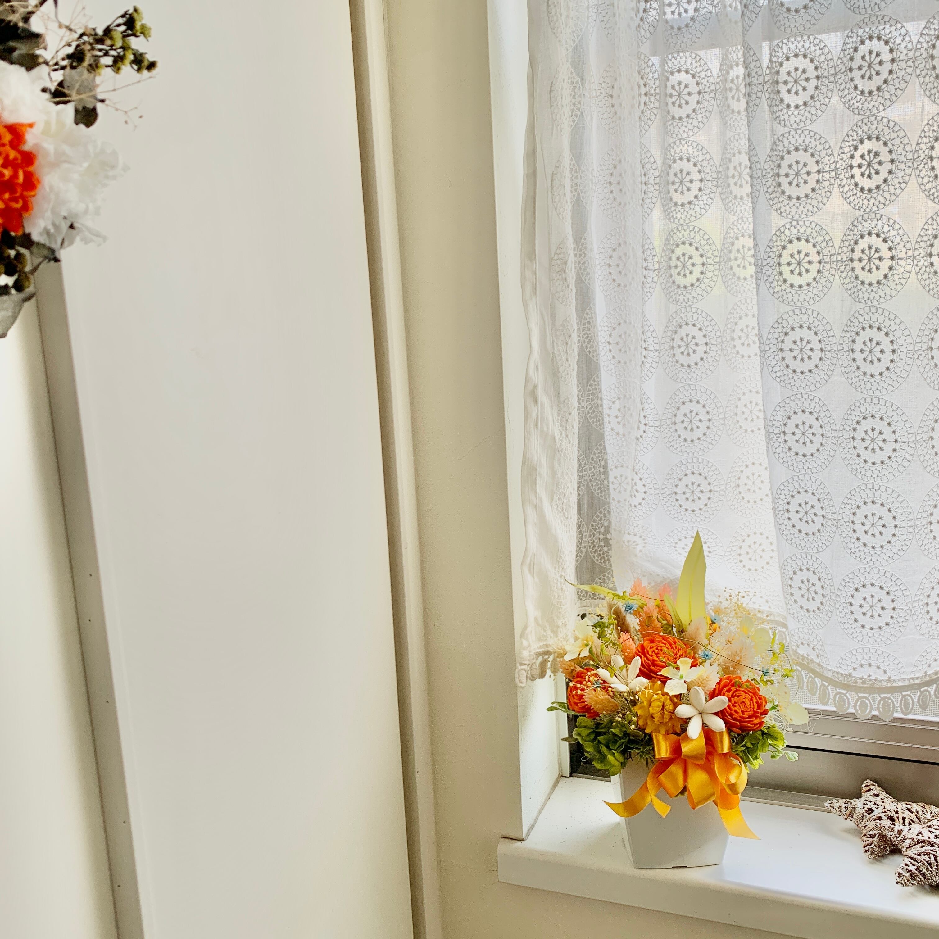 ベースは白いスクエアポット(プラスチック素材です)。メインのオレンジのお花と、ドライフラワーの小花たちは、ナチュラルな優しさと、自然の美しさを感じさせてくれます。リボンは光沢のあるイエローのサテンリボンで、より明るい印象に仕上がっています。