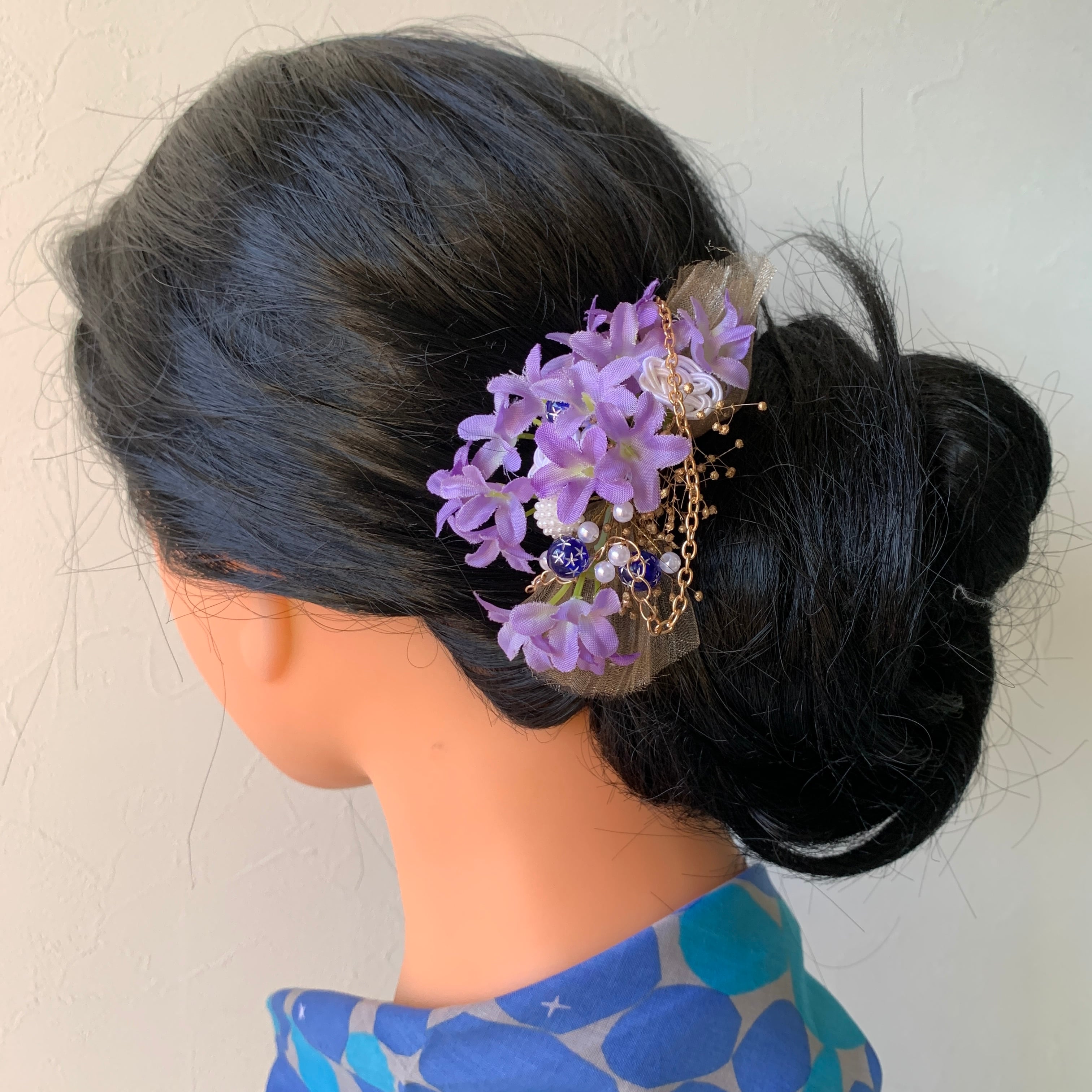 浴衣姿の大人の髪を華やかに彩る、ライラックの花の髪飾りができました!